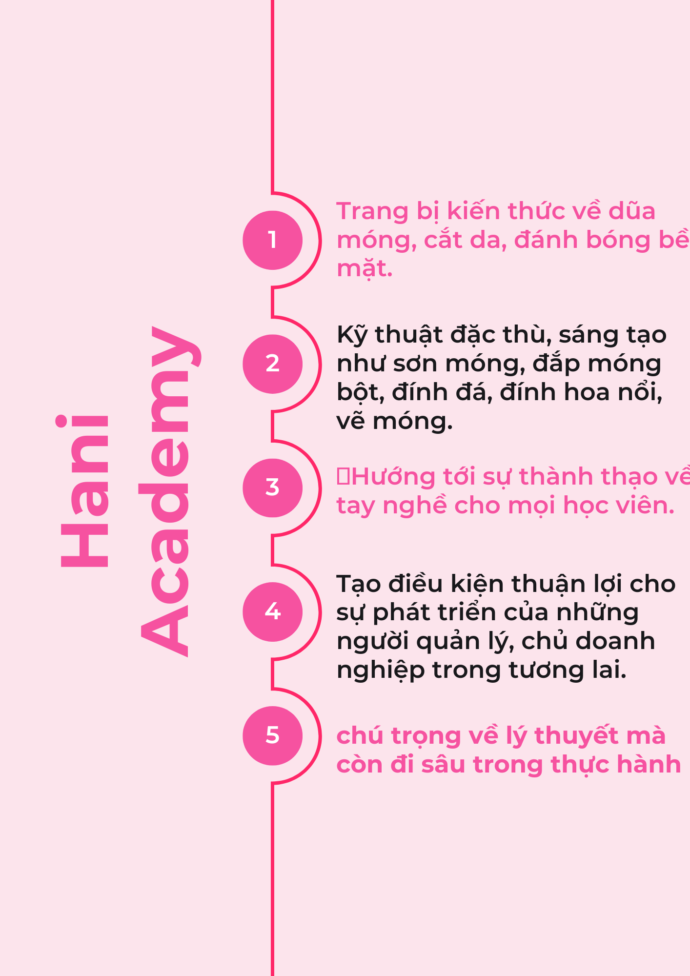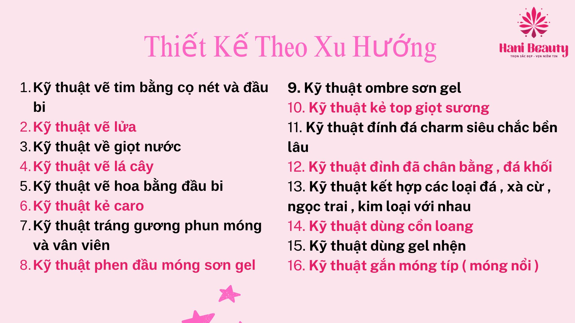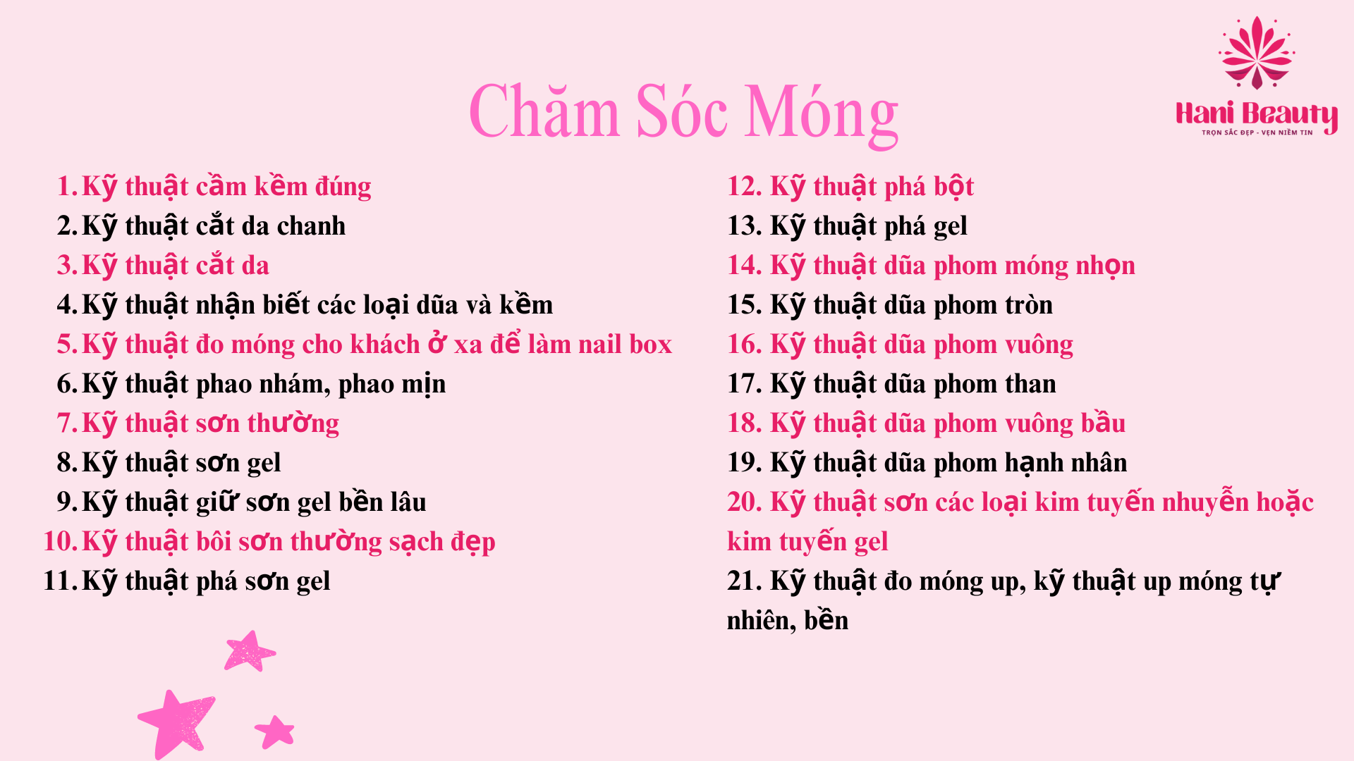 - Học Nail Salon tại Hani Beauty bạn sẽ được cập nhật những kiến thức bài bản, chính thống. Chương trình đào tạo hiện có các nội dung chính như sau: