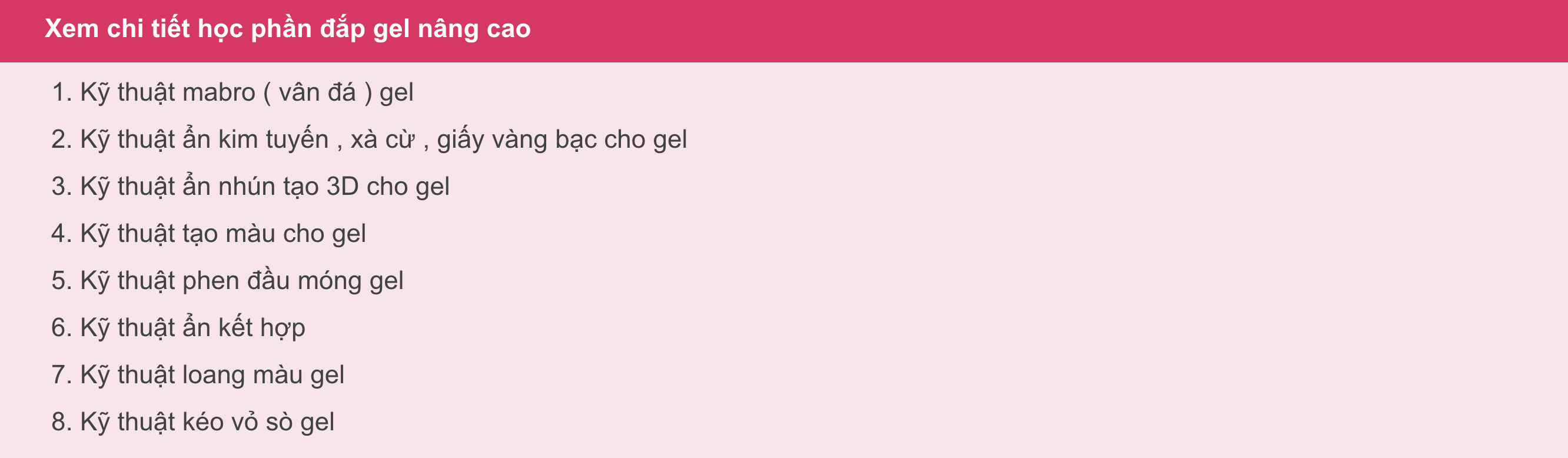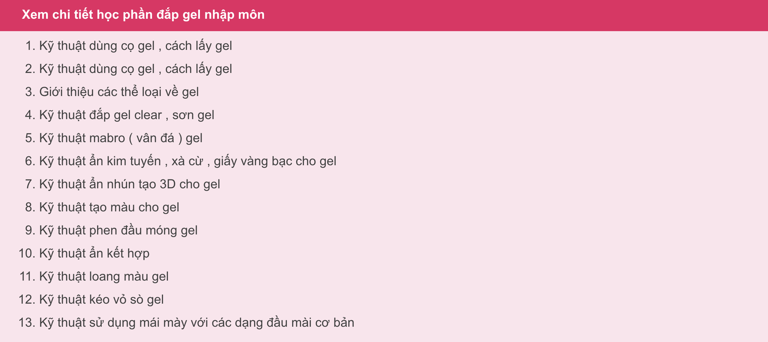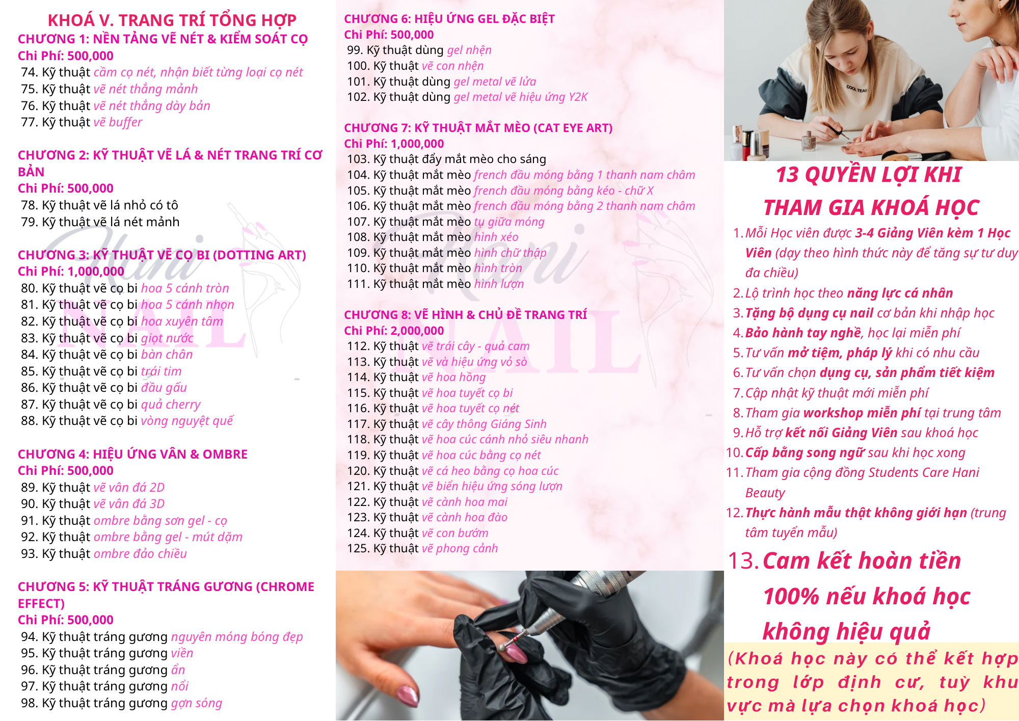 - Khóa học Nail Salon bao gồm nhiều chủ đề quan trọng. Cụ thể như sau: