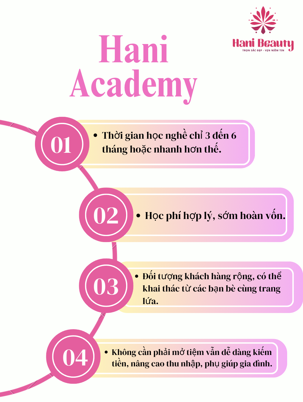 - Hani Beauty lấy học viên làm trung tâm, luôn tạo điều kiện tốt nhất để mỗi cá nhân phát triển. Tham gia tại đây bạn sẽ nhận lại những quyền lợi như: